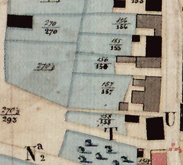 Nieruchomość nr 157 i sąsiednie około 1851 r. Fragment „Odrysu siedzib miasta Ciechanowa”, w: Kęsik G.: Joachima Łuszczewskiego plan i rejestr pomiarowy siedzib miasta Ciechanowa z 1851 r. – Warszawa; Ciechanów, 2019) U – ul. Warszawska Wielka, Na – ul. Pstra (obecnie Sierakowskiego)